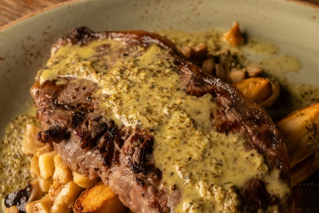 - Full Moon Strip Frites — a grilled NY strip with steak-cut fries, roasted Full Moon mushrooms, and housemade chimichurri